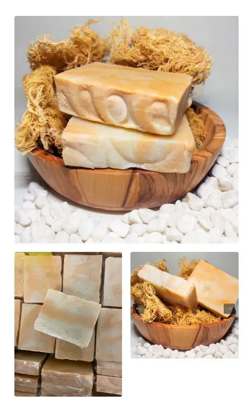 Our Gold sea moss soap are made with Sea moss powder, Olive oil, Shea butter, Coconut oil, Green tea fragrance oil, Lemon grass.