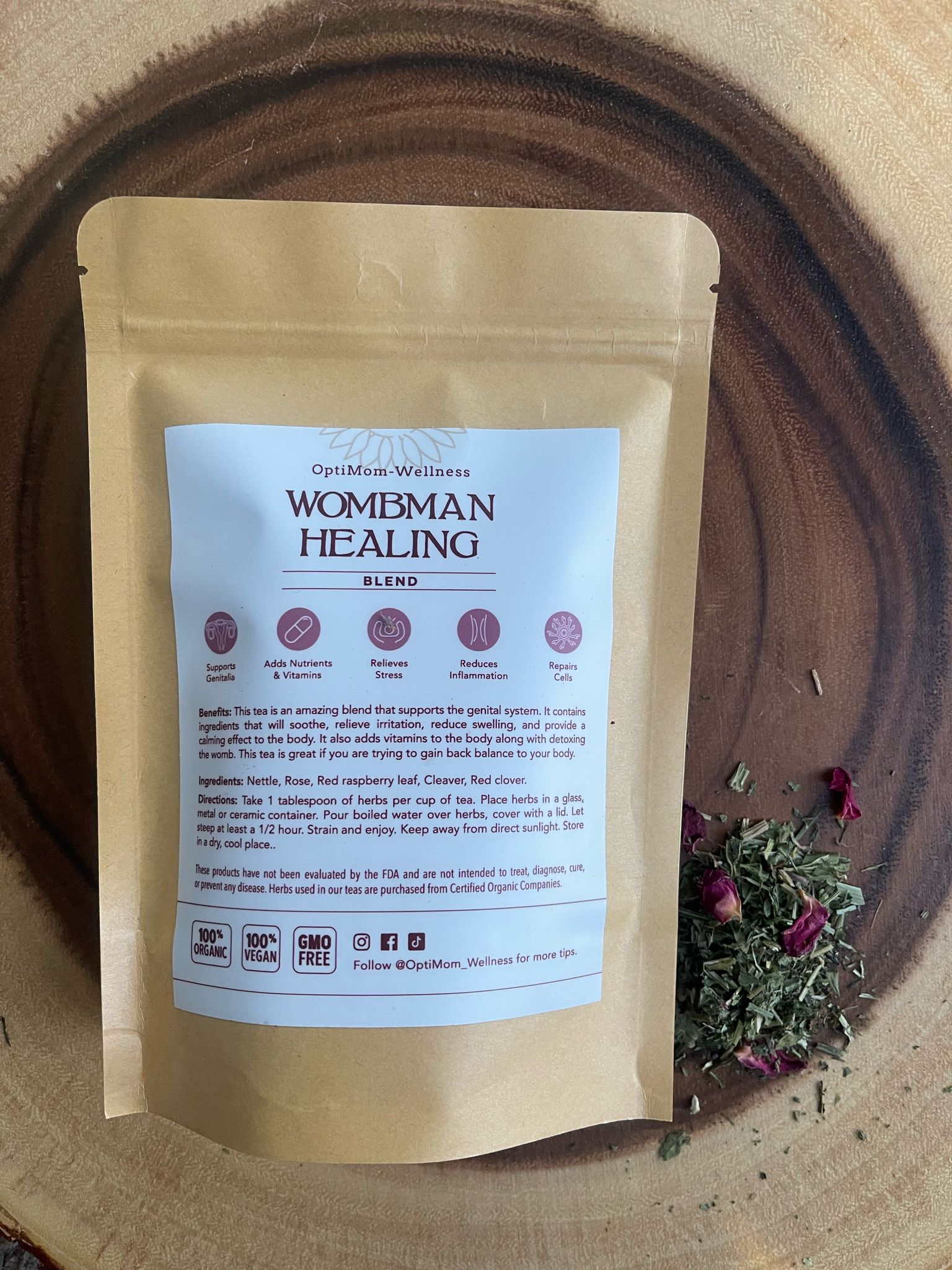 Nettle, Rose, Red Raspberry Leaf, Cleaver, Red Clover.